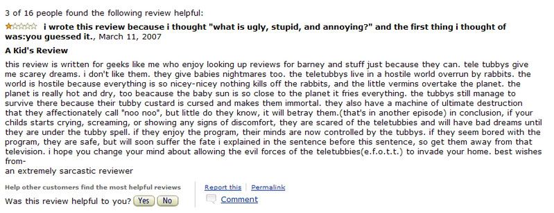i can't remember any other stories about teletubbies except for this. i heard this recently, i forgot who told me about this. but the teletubbies were sort of cursed, because the factory which manufactures the merchandise was haunted. then all the spirits went into the toys, which explains the unusual and non-natural behavious of the lifeless objects.